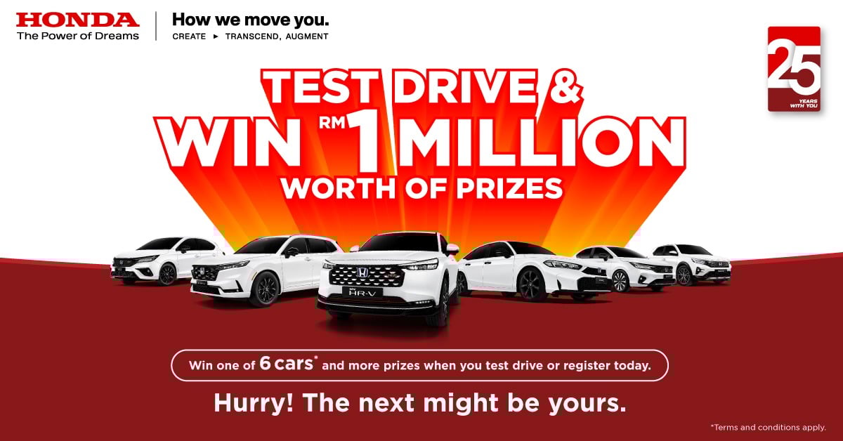 - Lucky Draw Prizes Worth Up to RM1 Million – Six Honda models are up for grabs: WR-V RS, City RS, City Hatchback RS, Civic RS, New HR-V (V variant), and CR-V e:HEV RS. Customers who test drive or register a Honda model receive at least one lucky draw entry*. Two winners will be announced monthly on Honda Malaysia’s official Facebook page and via dealer networks.
