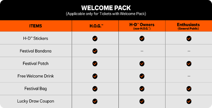 | Price (with welcome pack) | 1,299 THB | 1,499 THB | 1,099 THB | 1,299 THB | Festival Brand, Custom Kings Vote, Games Card, H-D Stickers, Bandana, Welcome Drink, Festival Bag, Lucky Draw Coupon & Other Attractions |