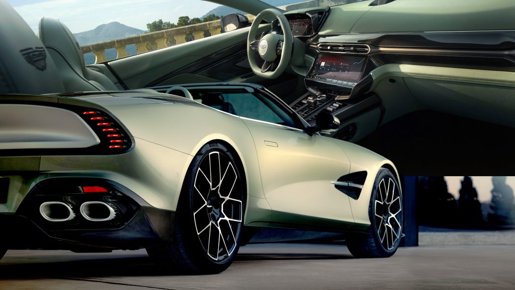 The soft-top roof, which can be deployed in just 14 seconds at speeds of up to 50 km/h, seamlessly integrates with the car’s silhouette. Whether the roof is up or down, the Vanquish Volante exudes class and sophistication.